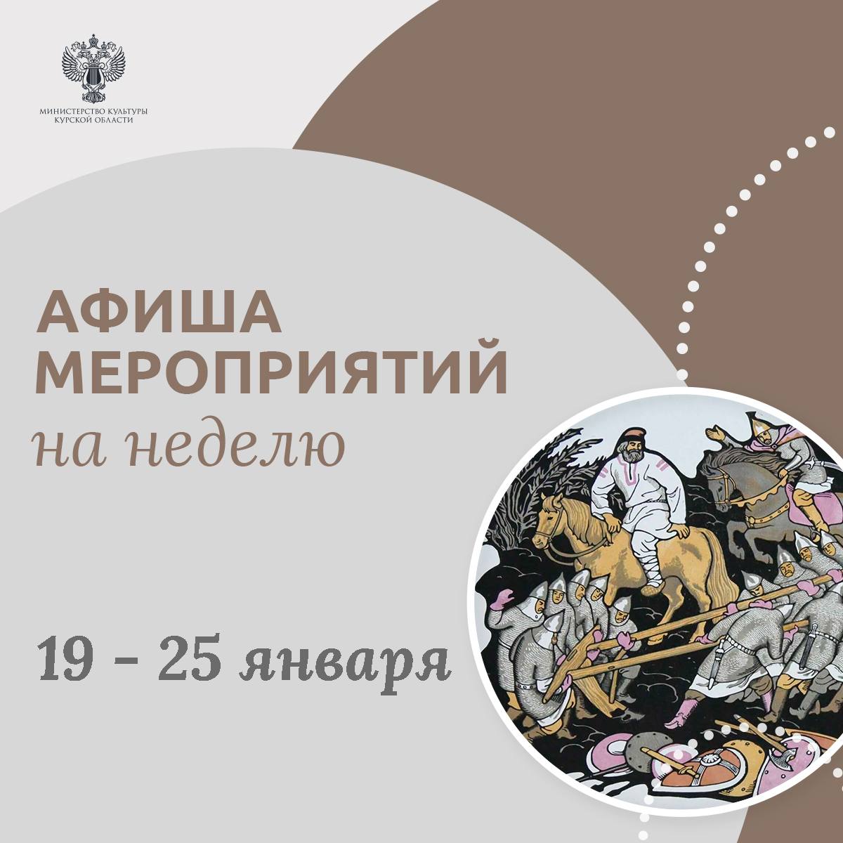 • 25 января в 12:00 – лекция «Курские слободы: история, традиции и быт» в музее археологии; в 18:00 – спектакль «Кьоджинские перепалки» в драмтеатре.