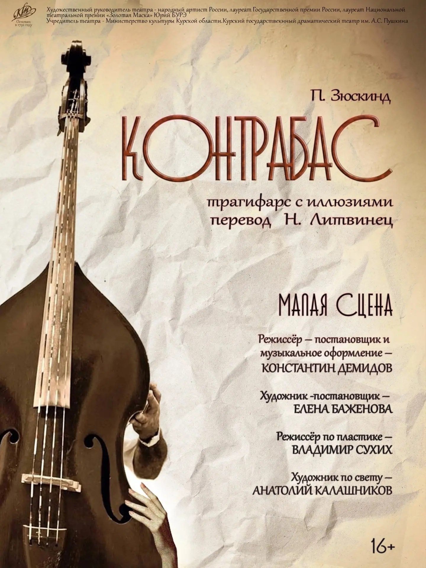 29 марта на Малой сцене Курского государственного драматического театра им. А. С. Пушкина - трагифарс с иллюзиями «Контрабас» по первому произведению Патрика Зюскинда.