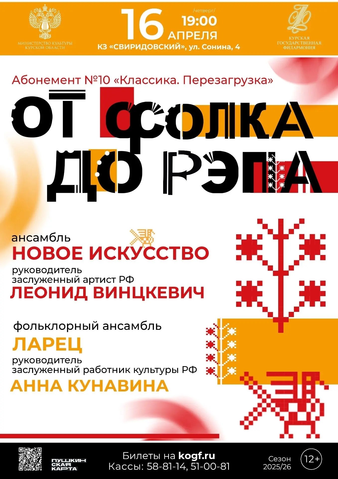 «От фолка до рэпа» – это музыкальное путешествие от народных мотивов Средней полосы до отечественного джаза и современных ритмов. Слушателей ждут неожиданные обработки традиционных песен, включая плеховский фольклор Курской области.