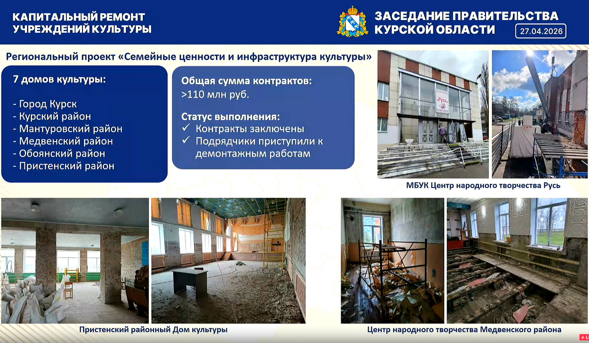 Работы проходят в рамках регионального проекта «Семейные ценности и инфраструктура культуры». Общая сумма контрактов превысила 110 миллионов рублей. Обновление ждут учреждения в Курске, а также в Курском, Мантуровском, Медвенском, Обоянском и Пристенском районах.