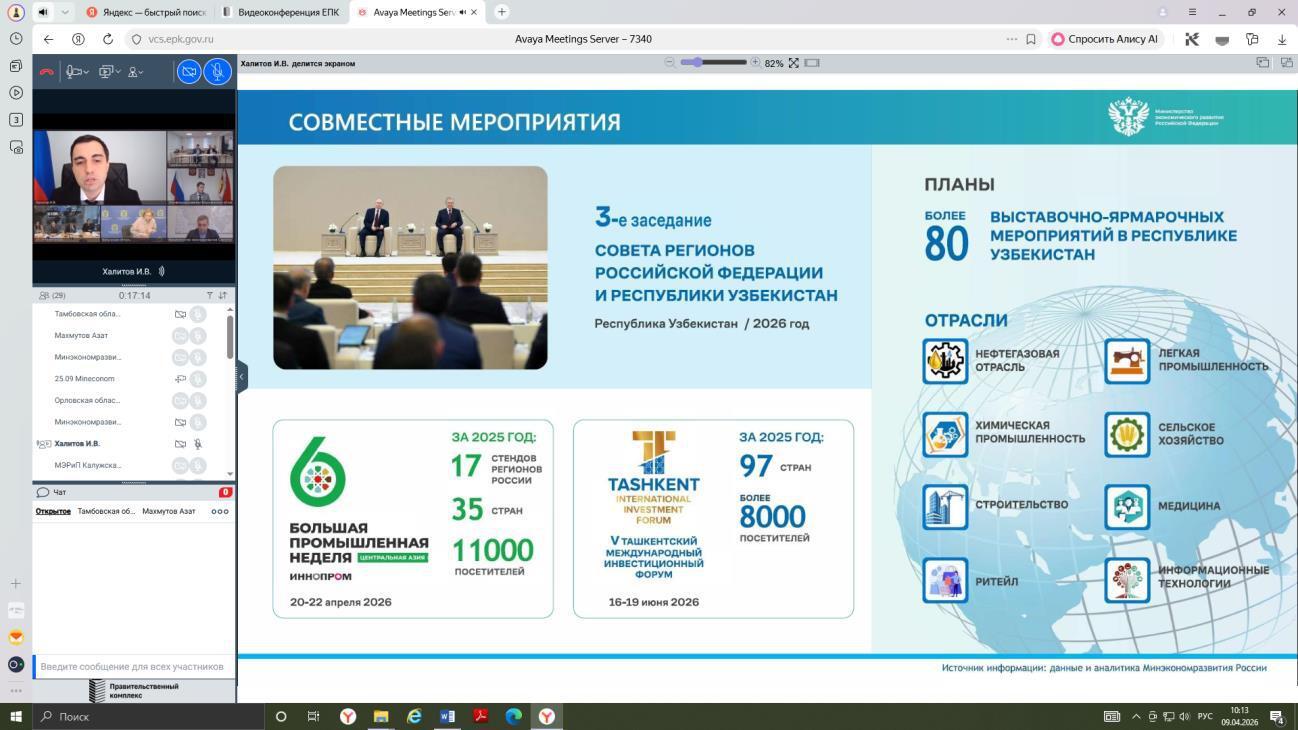 Совещание проведено Министерством экономического развития Российской Федерации под председательством директора Департамента экономического сотрудничества со странами СНГ Алексея Михайлова.