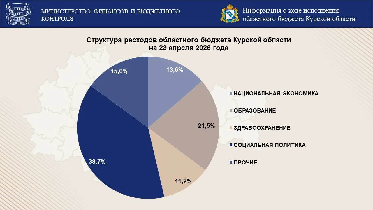 Наибольший удельный вес в расходах областного бюджета Курской области на 23 апреля 2026 года имеют средства, выделяемые на социальную политику – 38,7 %, образование – 21,5 %, национальную экономику – 13,6 %, здравоохранение – 11,2%.