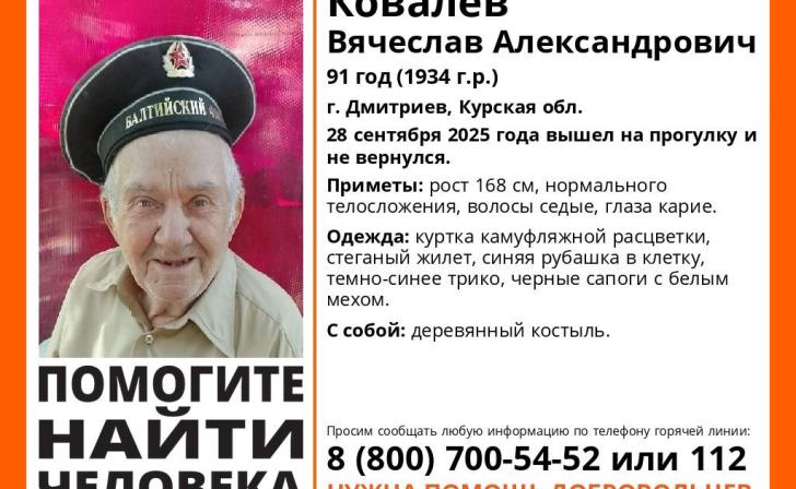 Волонтеры поискового отряда "Лиза Алерт" сообщают, что 91-летний Ковалев Вячеслав Александрович вышел на прогулку 28 сентября и не вернулся.