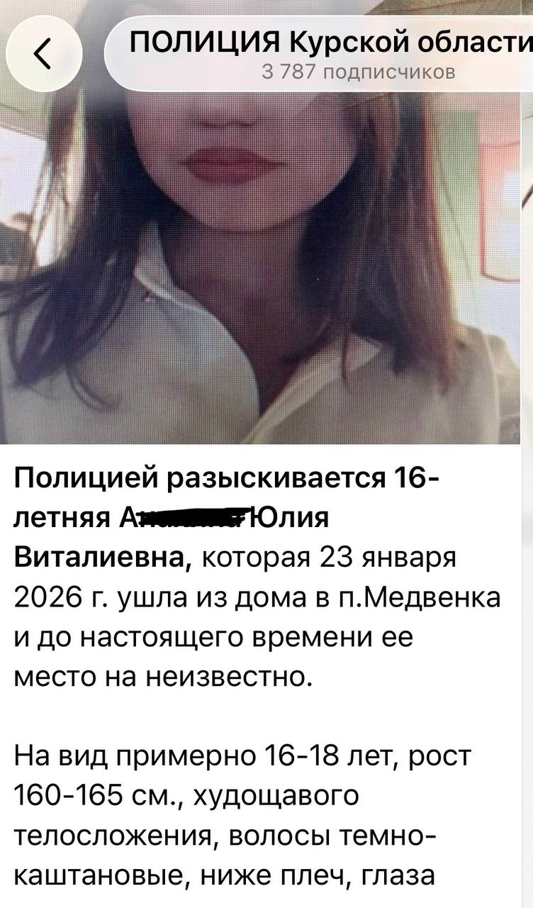 В Курской области разыскивается 16-летняя Юлия Виталиевна Анахина.Девушка ушла из дома в поселке Медвенка 23 января 2026 года. До настоящего времени ее местоположение неизвестно.В полиции назвали приметы пропавшей. На вид примерно 16-18 лет...