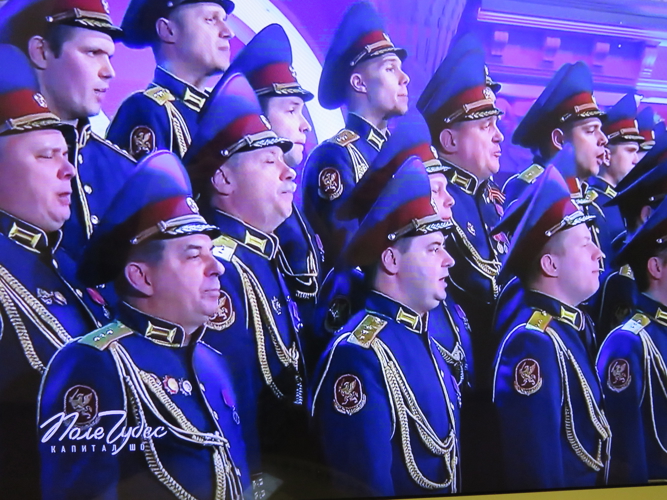 В завершение программы артисты Академического ансамбля песни и пляски Росгвардии исполнили патриотическую песню «Мы Родине служим» (муз.Н.Смирнова, сл.С.Кардаева, солисты – Заслуженный артист Республики Северная Осетия – Алания Евгений Яхин и Заслуженный артист Республики Дагестан Алексей Холявко). Зрители в студии тепло приветствовали выступление артистов легендарного коллектива.