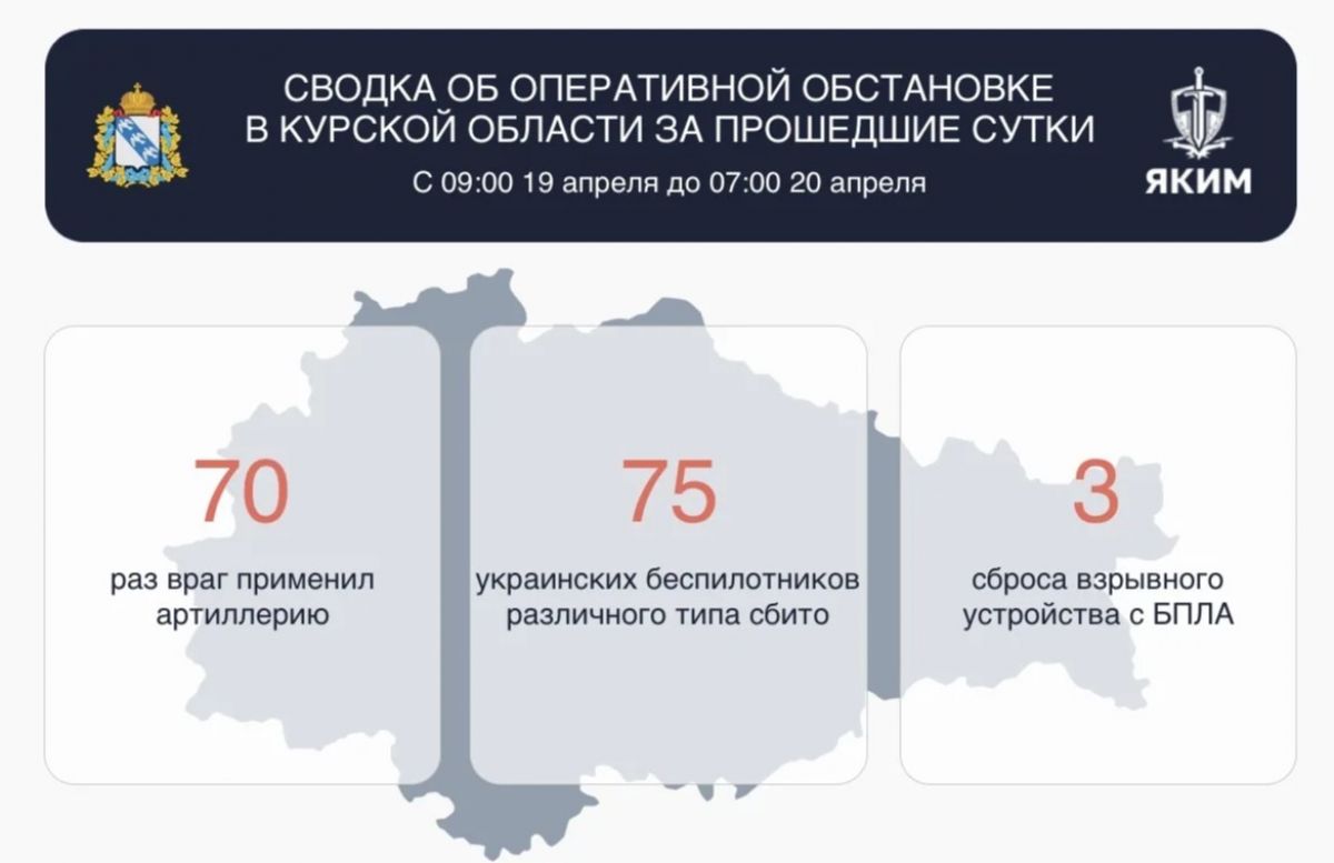 Меньше, чем за сутки было уничтожено 75 вражеских беспилотников различного типа. 70 раз ВСУ обстреливали курское приграничье из артиллерии. Три раза беспилотники атаковали гражданские объекты с помощью взрывных устройств.