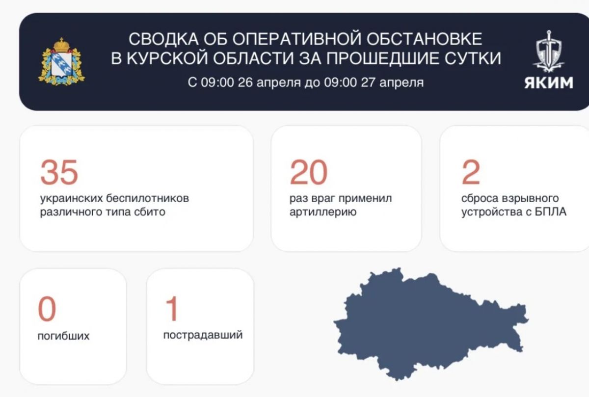Меньше, чем за сутки было уничтожено 35 вражеских беспилотников различного типа. 20 раз ВСУ обстреливали курское приграничье из артиллерии. Два раза беспилотники атаковали гражданские объекты с помощью взрывных устройств.