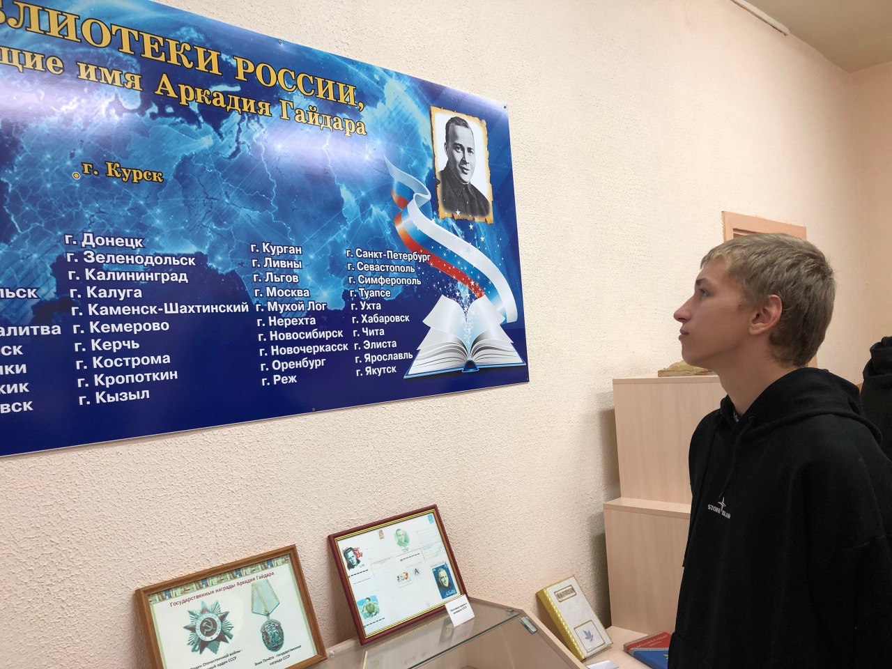 В Гайдаровском зале собраны материалы, связанные с именем писателя, его творчеством, эпохой, в которой жил и писал Аркадий Петрович. Ребята узнали о легендарной жизни и творчестве писателя.