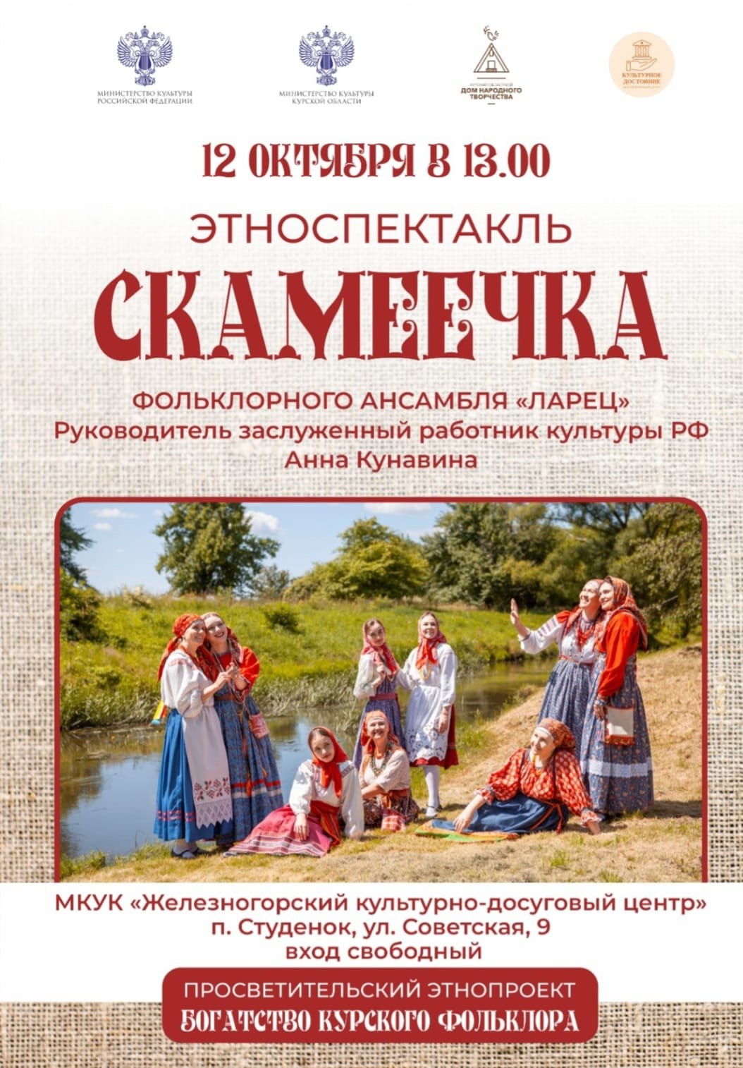 12 октября в 13:00 в Железногорском культурно-досуговом центре (п. Студенок, ул. Советская, д. 9) состоится этноспектакль «Скамеечка» фольклорного ансамбля «Ларец», вход свободный