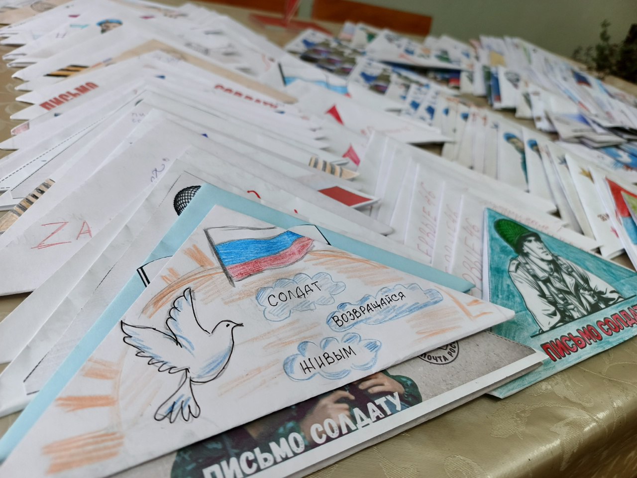 Мальчишки, девчонки и учителя выразили признательность нашим солдатам, написали, что они гордятся настоящими защитниками Родины и желают им скорейшего возвращения домой. Свои работы дети украсили рисунками.