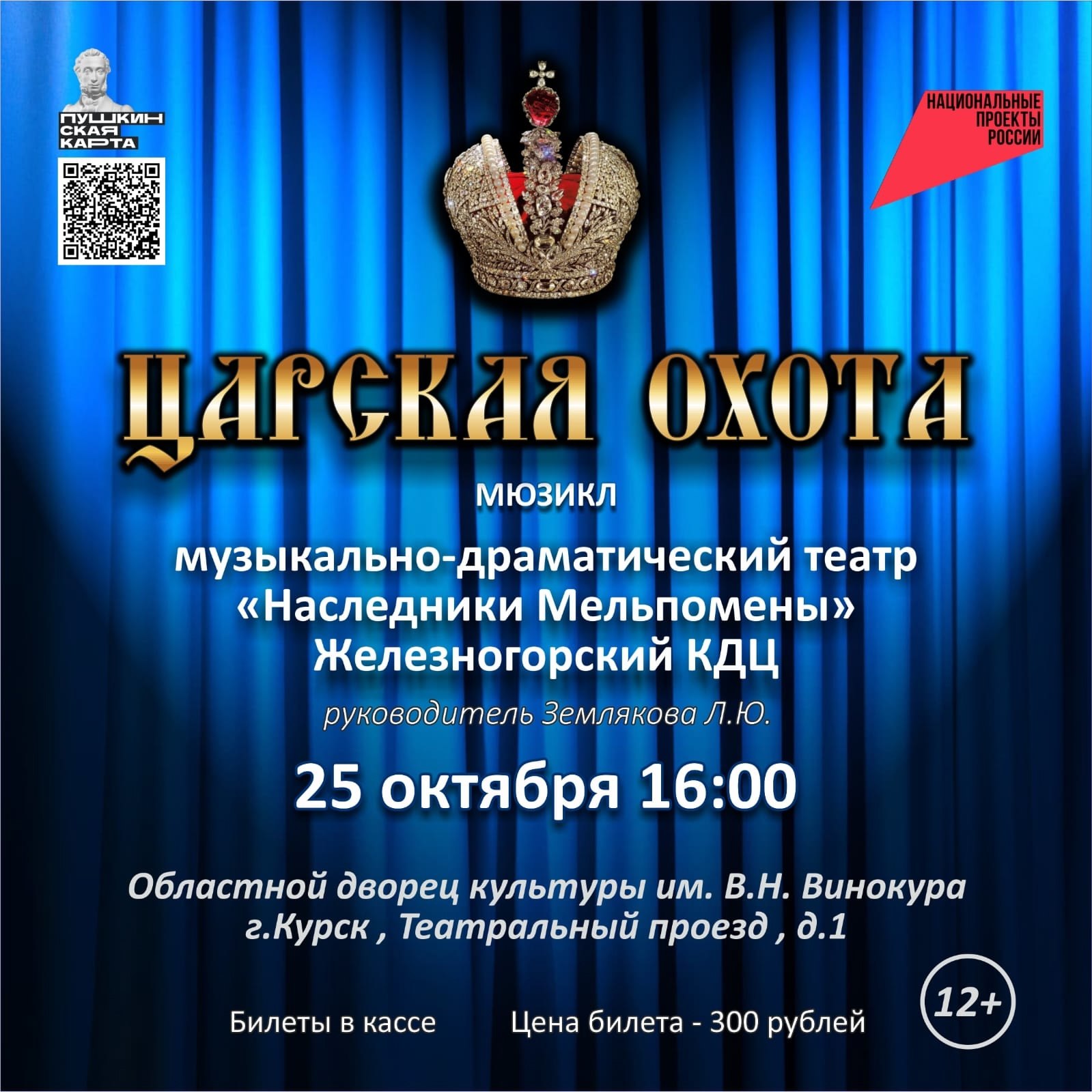Друзья! А вы знаете, что известный мюзикл "Царская охота" народного театра "Наследники Мельпомены" Железногорского культурно-досугового центра могут увидеть и жители города Курска 25 октября на сцене областного Дворца культуры им. В.Н. Винокура.