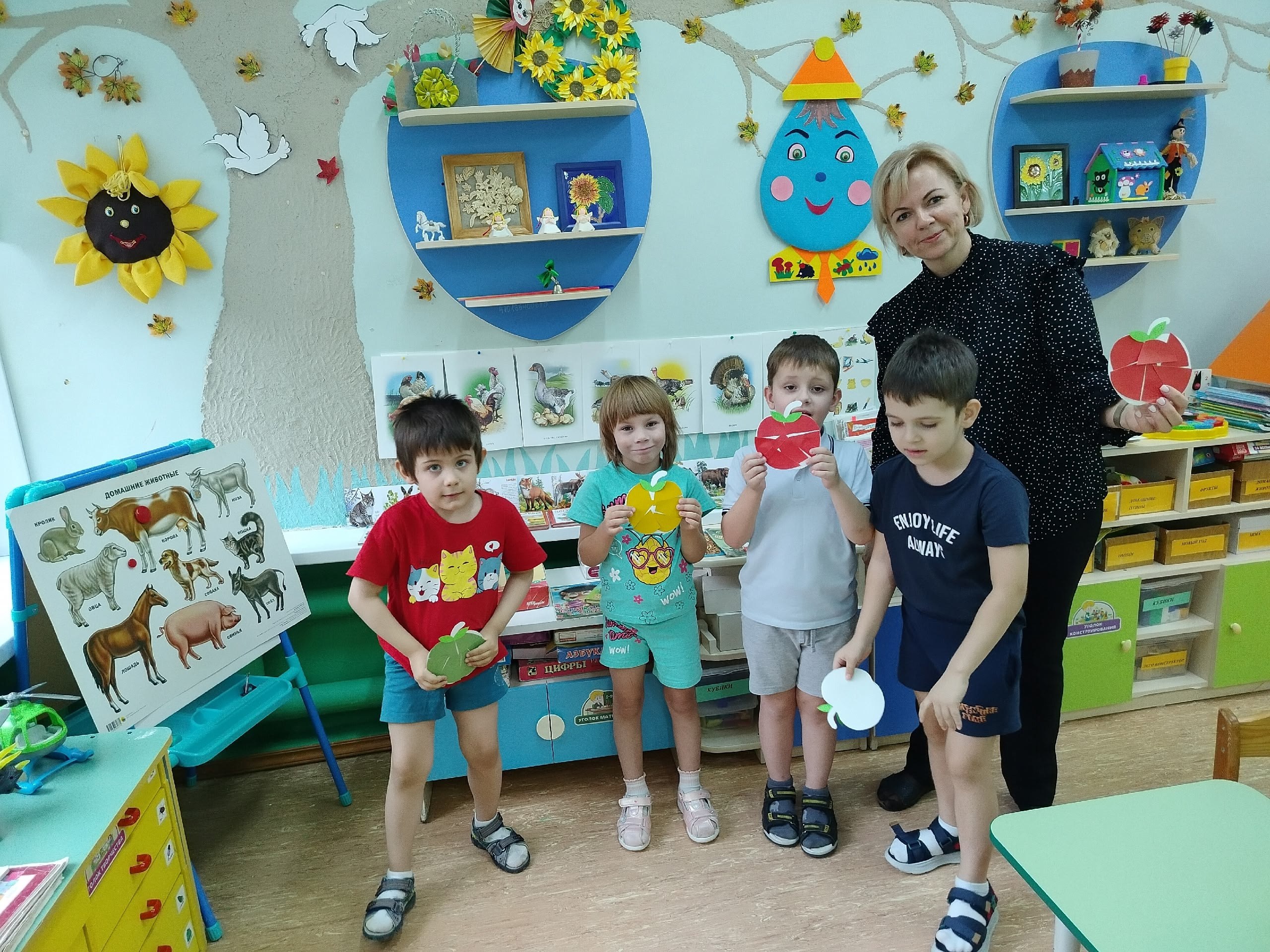Весело и дружно дети поиграли в игры: «Покатилось яблочко по кругу», «Пронеси не урони», «Сортировка яблок».
