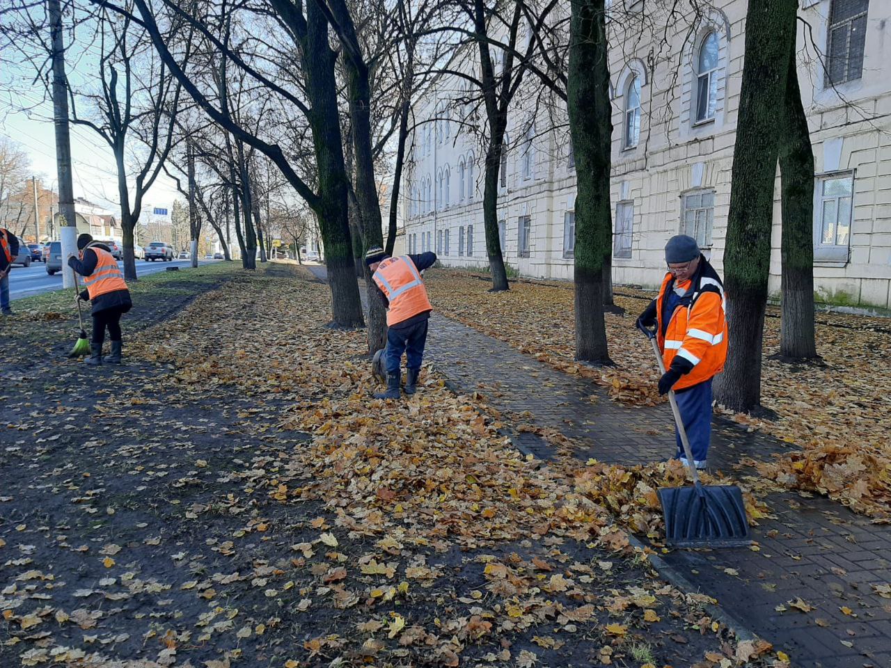 Бригады убирают опавшие листья, удаляют загрязнения с дорог и тротуаров, собирают и вывозят мусор с остановок и из укрытий.