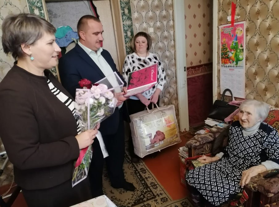 Сегодня свой 95-й юбилей отмечает Прасковья Никифоровна Васильева. Солидный и почтенный возраст. Поздравить именинницу и поблагодарить за самоотверженный труд приехали врио Главы района Леонид Дрючин, начальник отдела ЗАГС, начальник отдела социальной защиты населения, заместитель директора ОБУСО «Льговский МКЦСОН». Они выполнили приятную миссию – вручили юбиляру, труженице тыла, имеющей статус «Дети войны» поздравительную открытку от Президента нашей страны Владимира Владимировича Путина, приветственный адрес, цветы и подарки от Администрации Конышевского района.