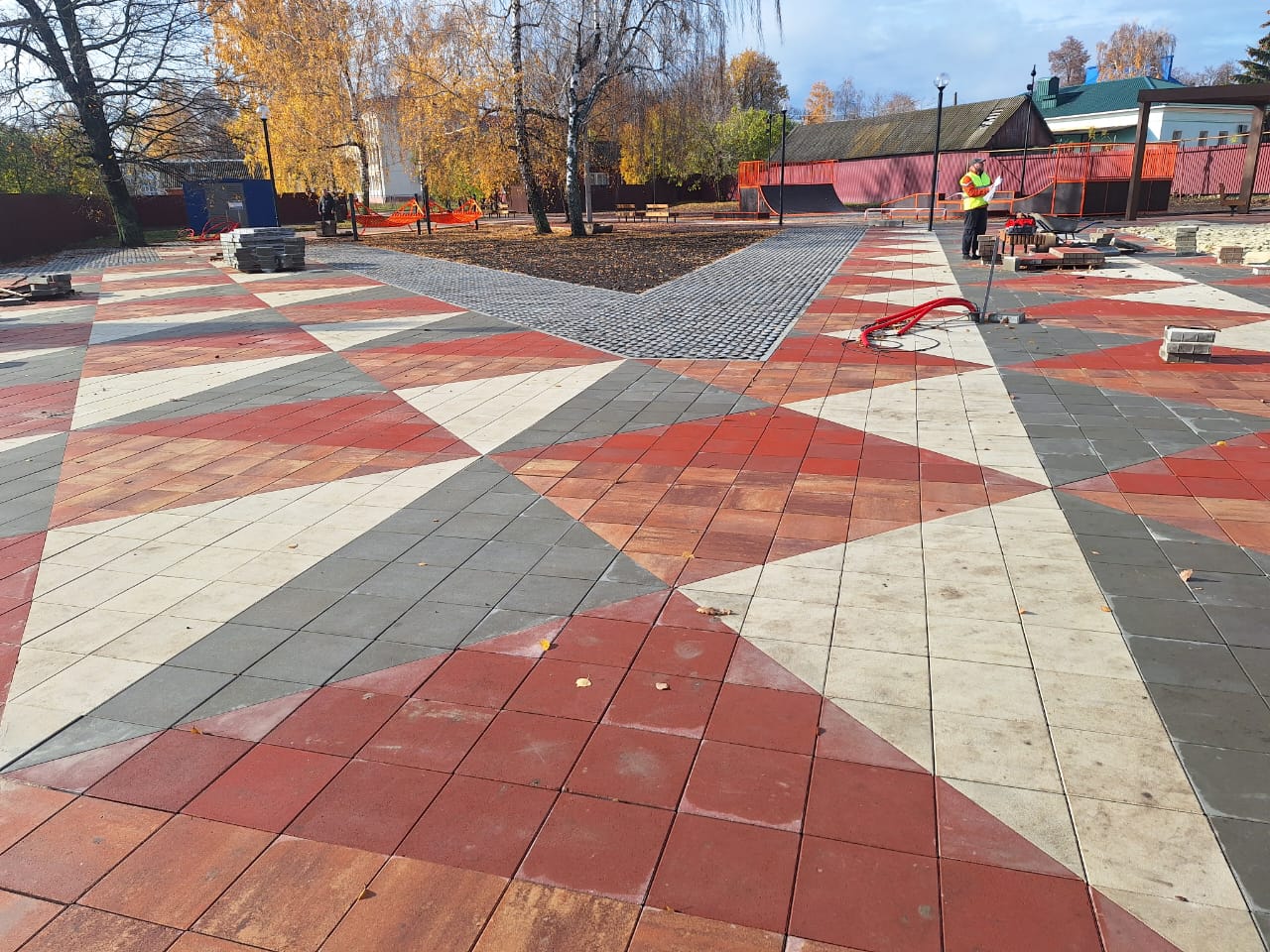 В завершающей стадии находятся работы по укладке плиточного покрытия на главной площади, возведению большой сцены для проведения массовых мероприятий, установке парковых скамеек и лавочек.