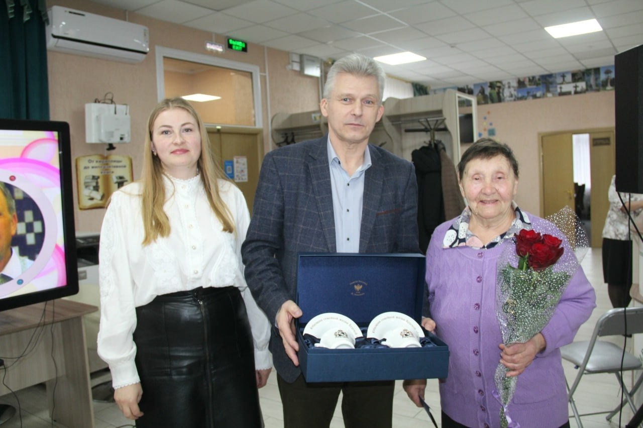 Юбилярам были вручены памятные подарки, наборы с двумя чайными чашками и блюдцами с Гербом Курской области и поздравительные открытки,от Губернатора Курской области Александра Евсеевича Хинштейна, а так же букеты цветов, символизирующие красоту и долговечность их чувств.