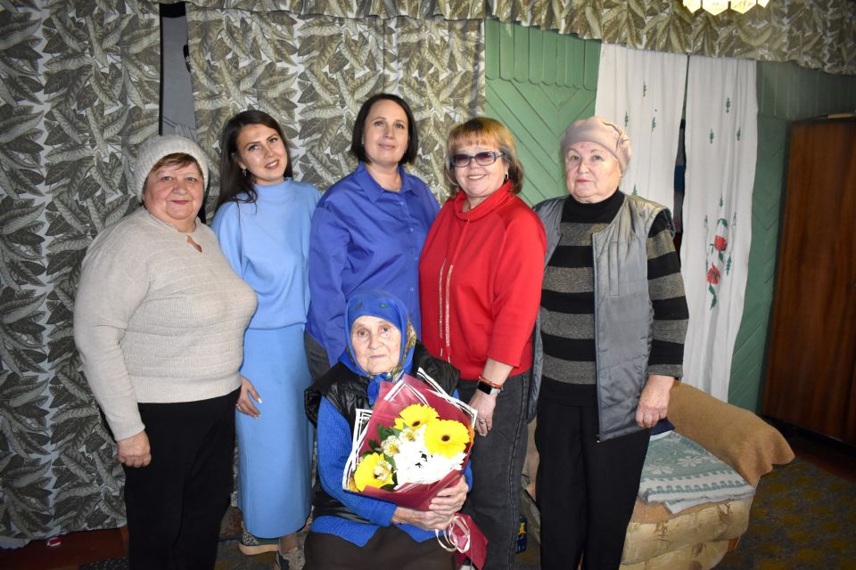 С таким значимым юбилеем ее прибыли поздравить гости из районной Администрации. Первый заместитель Главы района Елена Кириченко с пожеланиями крепкого здоровья, мира и добра вручила Раисе Симоненковой поздравительный адрес и букет цветов. К поздравлениям присоединились глава Студенокского сельсовета Екатерина Пахомова и консультант Управления социальной защиты населения Людмила Абрамова.