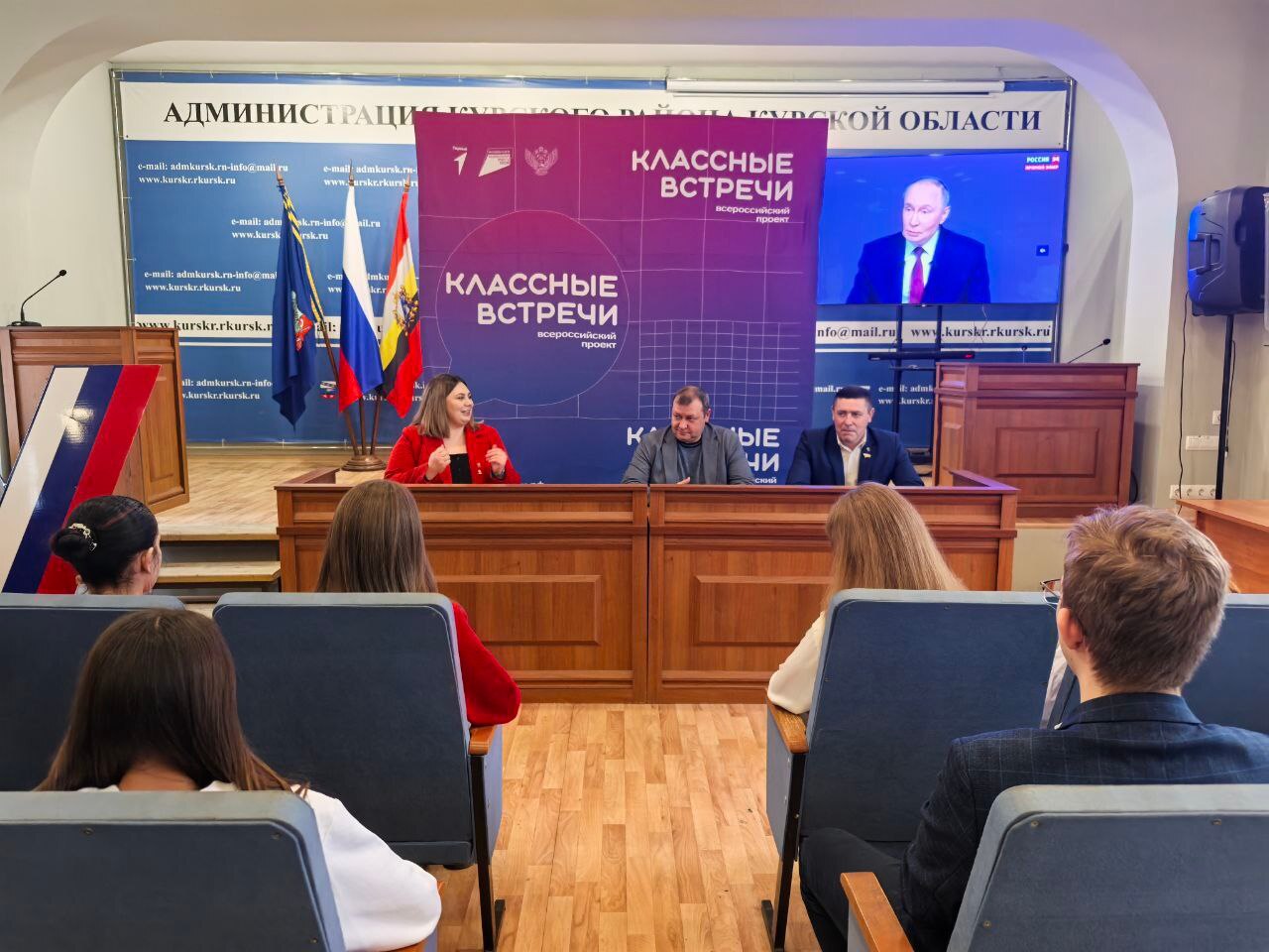 Сегодня в рамках Всероссийского проекта «Классные встречи» Глава Курского района по традиции пообщался представителями молодежного «Движения первых» и «Детской Администрации». Это – активные ребята и девчонки из школ нашего района. Вместе с Главой района они имели возможность просматривать трансляцию «Итогов года с Владимиром Путиным».
