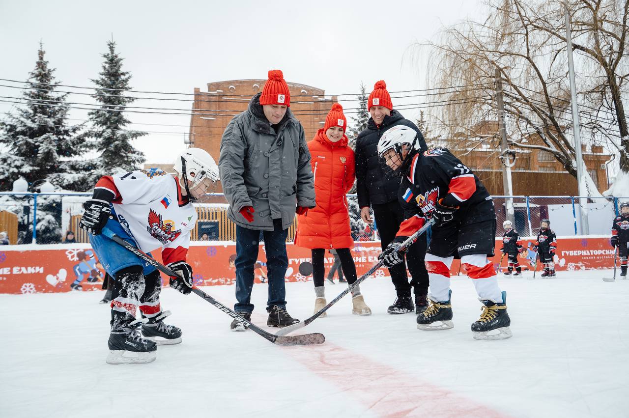 Как и обещал, открыли сегодня бесплатный каток в обновлённом парке Пионеров. Ознаменовали это товарищеским хоккейным матчем.