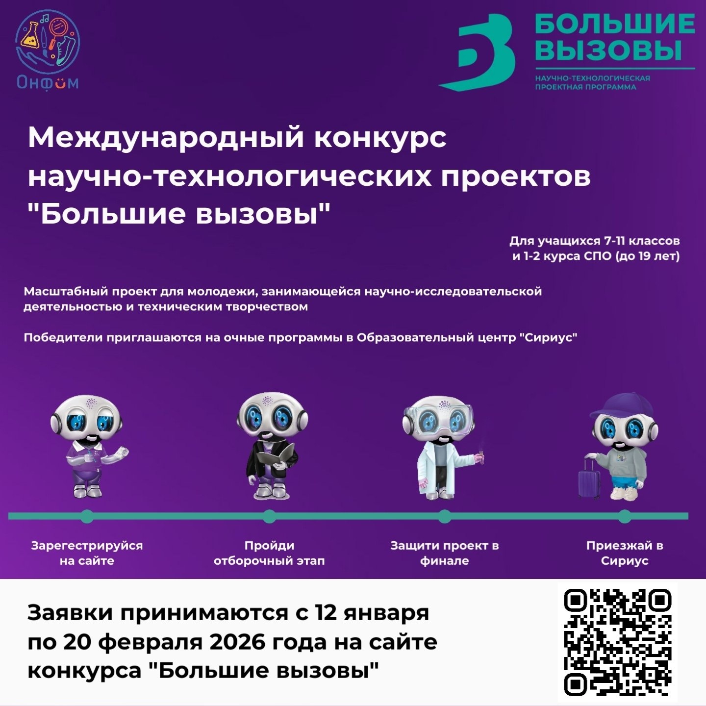 Стартовал новый сезон конкурса «Большие вызовы», который в этом году проводится в одиннадцатый раз. Это крупный международный конкурс научно-технологических проектов для школьников и студентов, занимающихся исследовательской и проектной деятельностью.