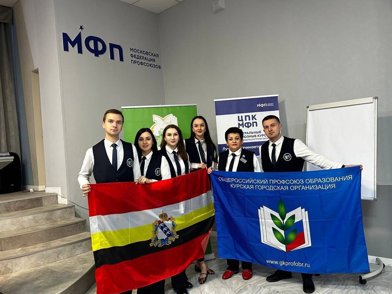 Наш регион представляют Анастасия Ильинова (школа № 58), Александр Гололобов (школа № 50), Кристина Мезенцева (школа № 62), Роман Колесников (школа № 60), Дарья Чефранова (ДДТ ЖД), Марина Боева — председатель Курской городской организации Профсоюза образования.