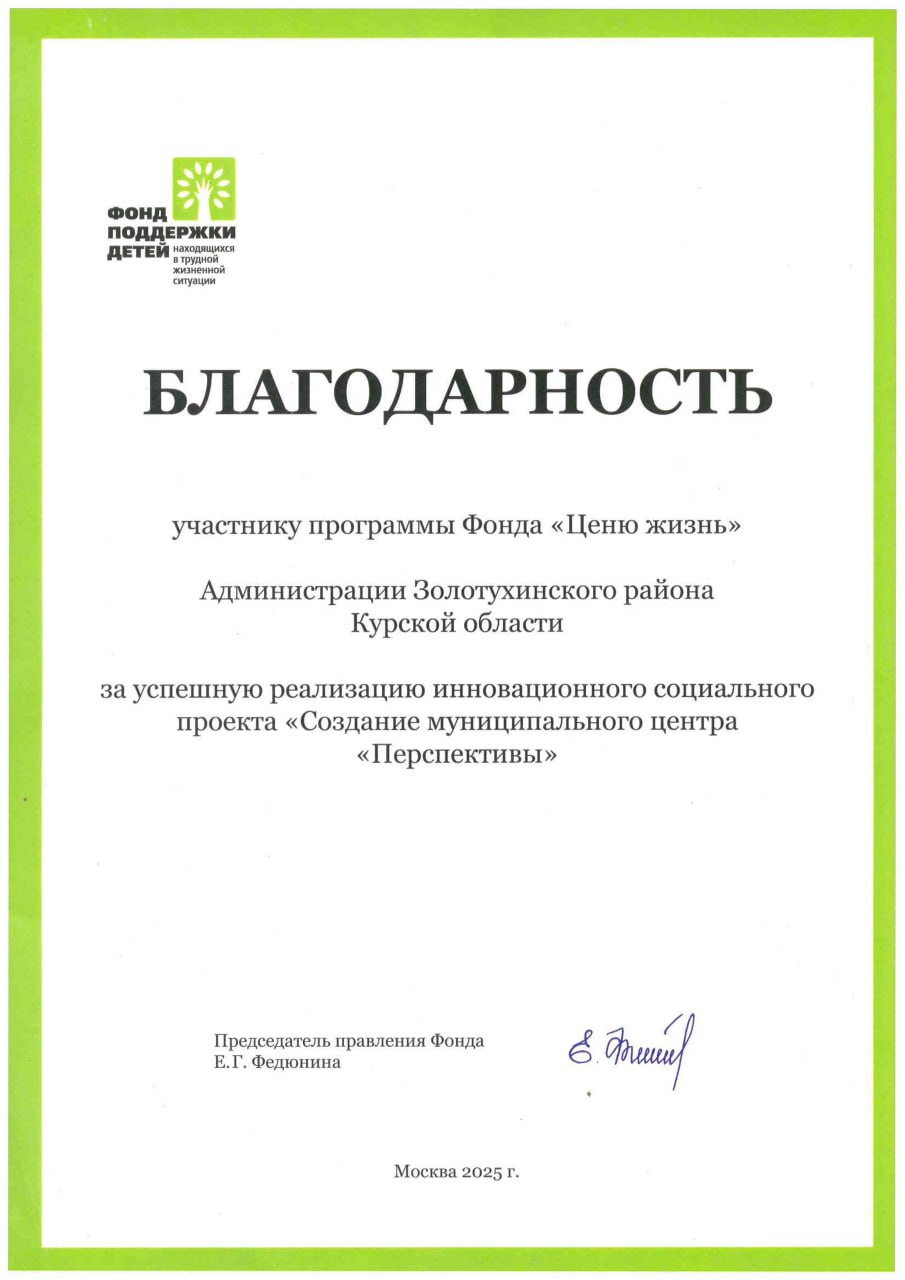Нашему району вручена Благодарность за успешно реализованный проект «Создание муниципального центра «Перспективы», направленный на содействие развитию системы профилактики безнадзорности и правонарушений несовершеннолетних в деятельности муниципальных образований, организованный при грантовой поддержки детей, находящихся в трудной жизненной ситуации, в рамках программы Фонда «Ценю жизнь».