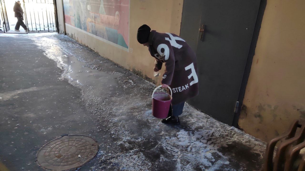 Сотрудники Центра поддержки молодежных инициатив обработали тротуар и вход в учреждение по улице Ленина в районе дома №15.