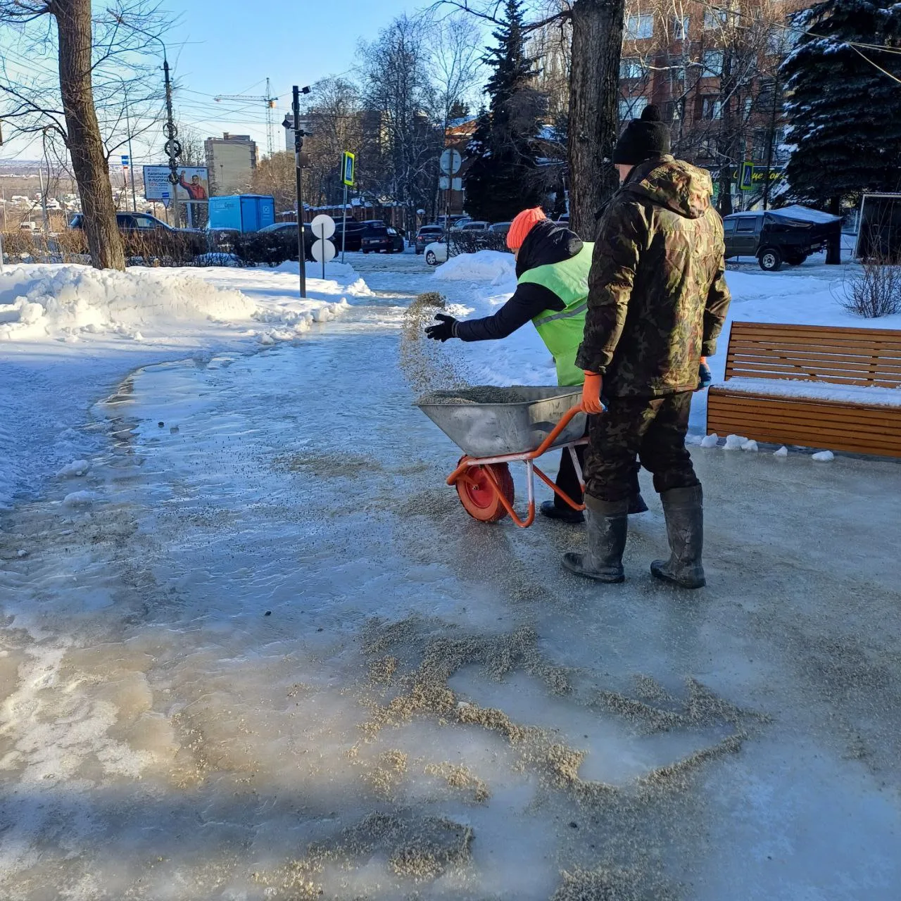 Сотрудники подрядной организации посыпают песко-соляной смесью и реагентами дороги и пешеходные зоны, уделяя особое внимание транзитным участкам и склонам.