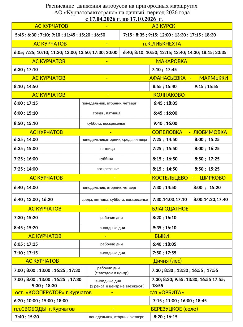 АО «Курчатовавтотранс» доводит до жителей Курчатова и дачников расписания движения автобусов с 17.04.2026 по 17.10.2026 на пригородных и дачных маршрутах