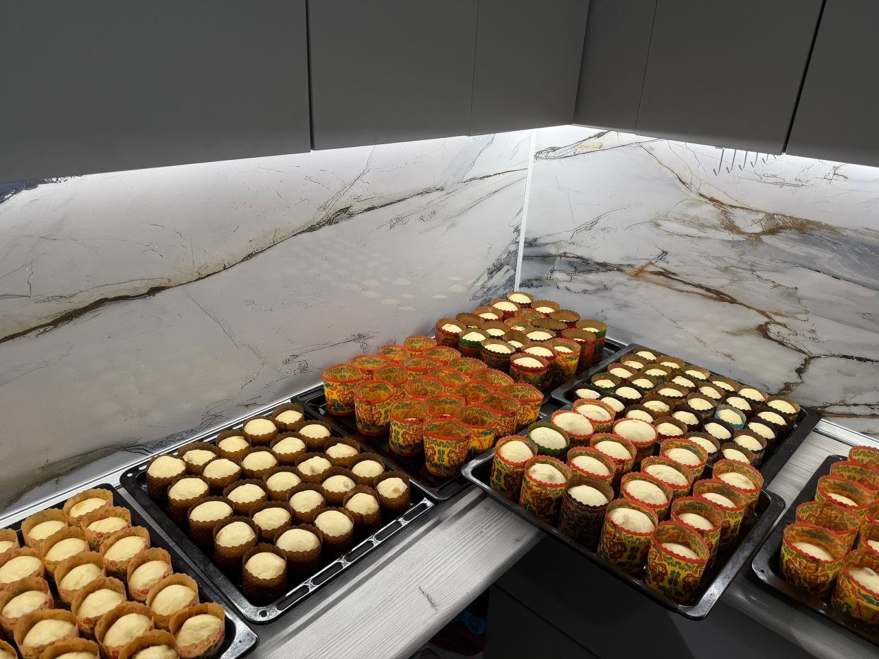 Добровольцы «Домика Добрых Дел» переоборудовали кухню под цех для выпечки. Кондитеры передали пряники и другие изделия для украшения пасхальных куличей. Всего добровольцы планируют раздать бездомным и нуждающимся около тысячи куличей.