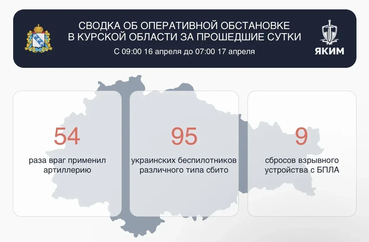 54 раза отселённые районы Курской области подверглись обстрелам артиллерии противника. 9 раз с дронов сбрасывали взрывные устройства.