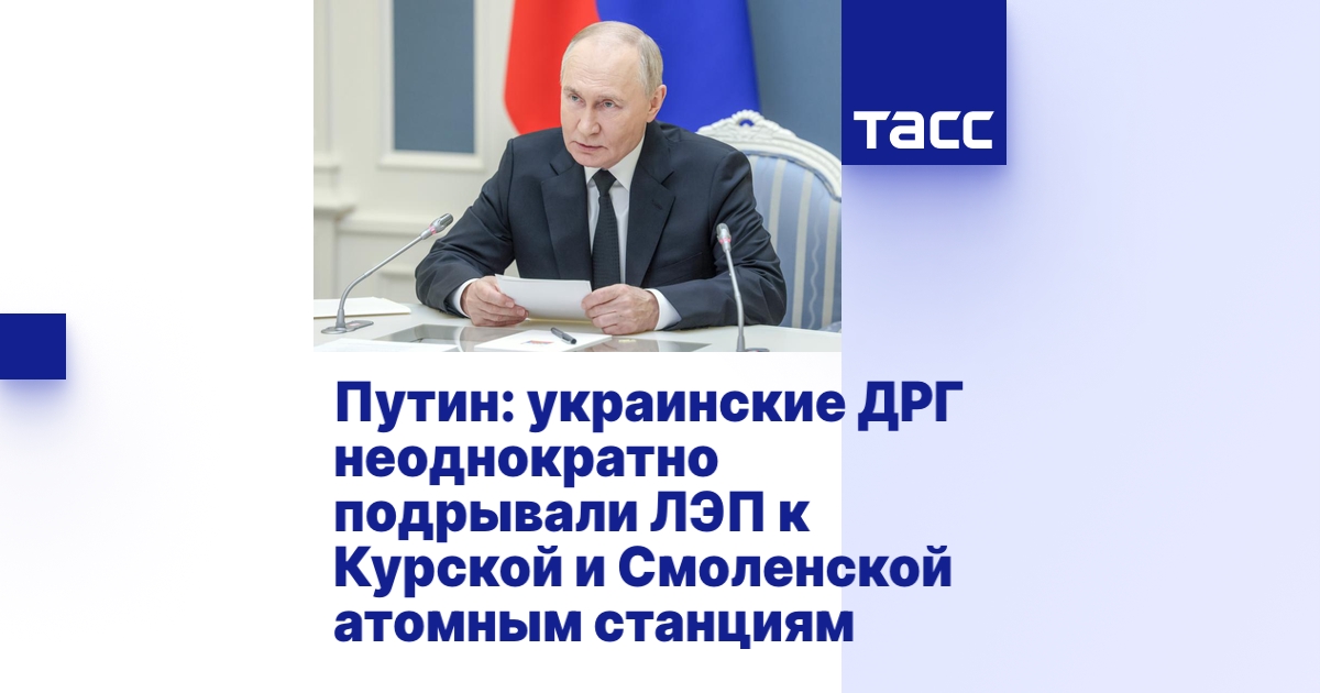 Редакция сайта ТАСС17:29Путин: украинские ДРГ неоднократно подрывали ЛЭП к Курской и Смоленской атомным станциям