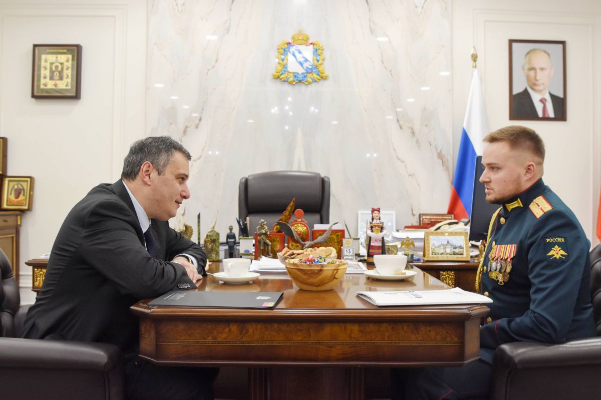 Губернатор Курской области Александр Хинштейн провел встречу с участником регионального проекта «Курск.Герои!» Александром Кретовым. Глава региона стал для участника СВО наставником.