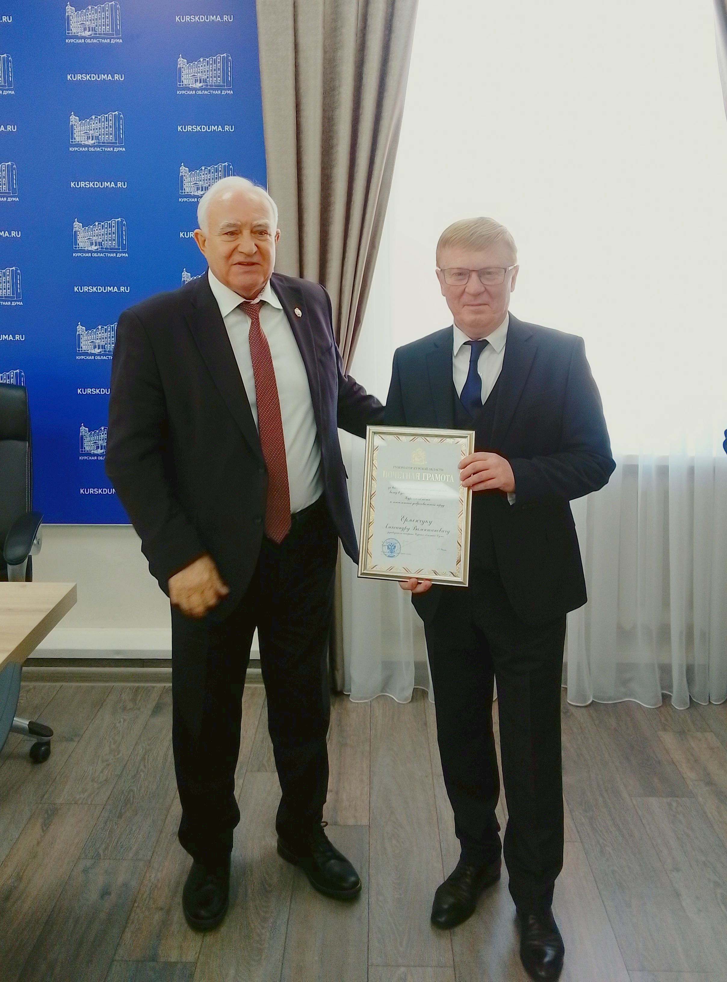 Именно с нее спикер и начал мероприятие: вручил сотрудникам аппарата регионального парламента награды губернатора Курской области Александра Хинштейна. Профессиональные достижения руководителя аппарата Александра Ерменчука были отмечены Почётной грамотой главы региона, а начальника управления по вопросам государственной службы, кадров, профилактики коррупционных и иных правонарушений Елены Карнаухих – Благодарностью.