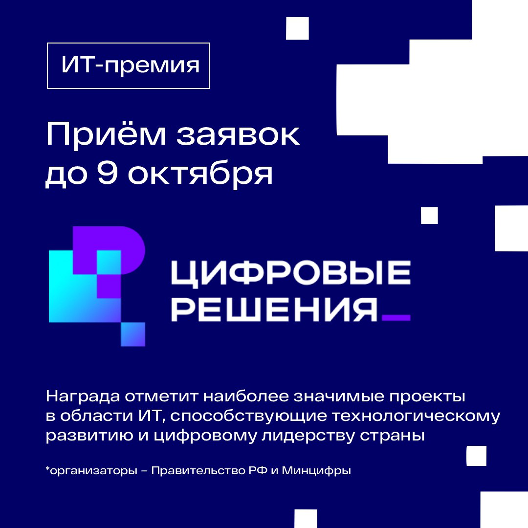 Для тех, кто хочет заявить о своём проекте, войти в число лидеров цифровой трансформации и получить признание профессионального сообщества пройдёт главная ИТ-премия года «Цифровые решения». На сайте https://xn--e1aglkf7g.xn--b1agaalewncctcd9amf6a8b1c5e.xn--p1ai/ уже стартовал приём заявок, он продлится до 9 октября.