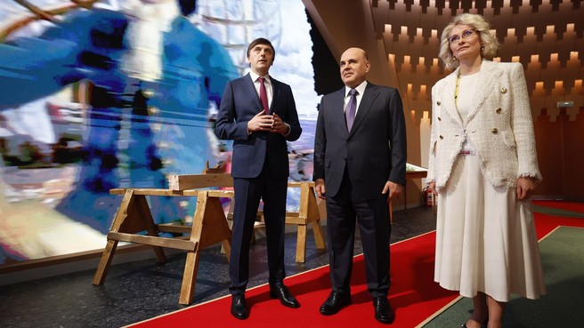 Михаил Мишустин осмотрел выставку «85 лет системе СПО: сила в мастерстве!». С Министром просвещения Сергеем Кравцовым и заместителем Председателя Государственной Думы Федерального Собрания Викторией Абрамченко
