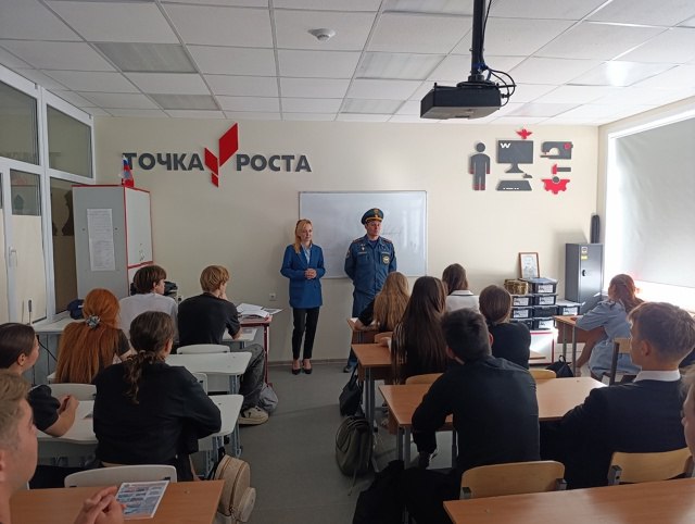 Старшеклассники встретились с заместителем начальника СПСЧ №2 Морозовым Александром Александровичем и инспектором группы профилактики пожаров СПСЧ №3 Гладченко Жанной Александровной - сотрудниками СО №3 ФГКУ "Специальное управление ФПС №72 МЧС России".