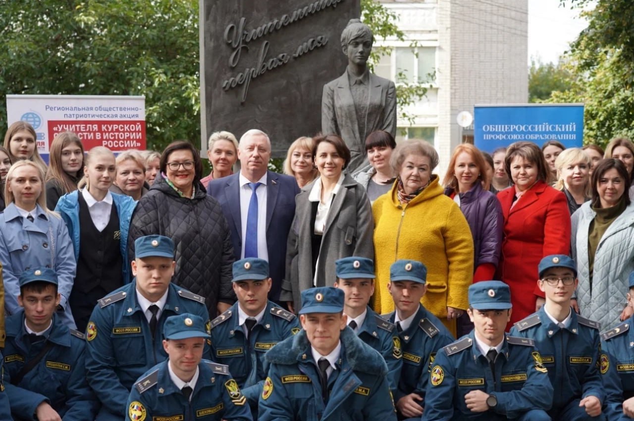 Накануне Дня учителя прошла церемония возложения цветов к монументу Первой учительнице. В церемонии участвовали студенты, преподаватели, представители Министерства образования и науки Курской области, а также областной организации Профсоюза образования.