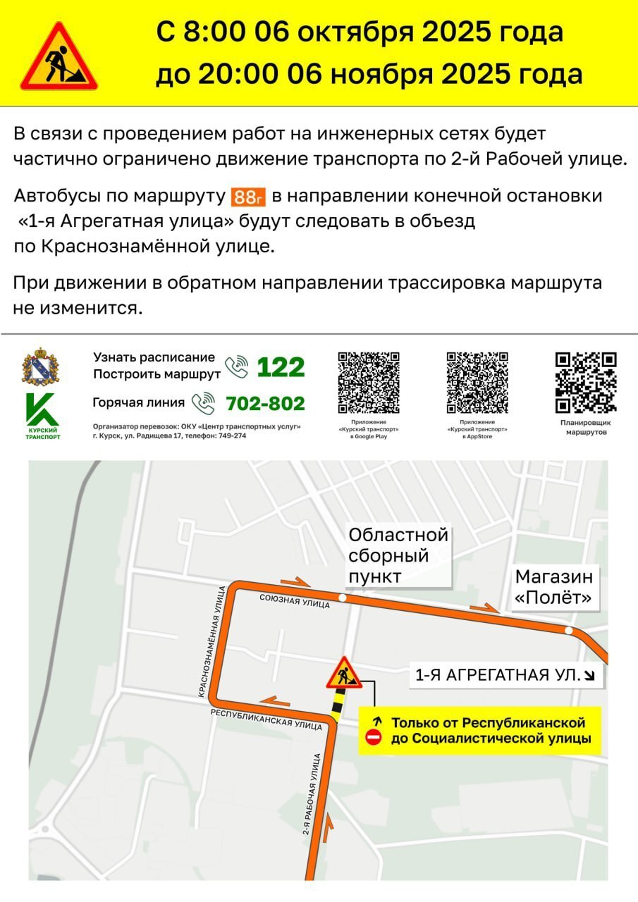 С 6 октября 8:00 по 6 ноября 20:00 частично ограничат движение транспорта по ул. 2-й Рабочей в Курске из-за работ на инженерных сетях.
