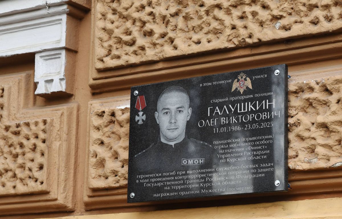 В Курске состоялось открытие мемориальной доски в память о старшем прапорщике полиции Олеге Галушкине, сотруднике ОМОН "Финист" Управления Росгвардии по Курской области, погибшем при исполнении служебного долга. Мемориальная доска установлена на фасаде Курского монтажного техникума имени Героя России Артура Лапшина, где учился Олег Галушкин.