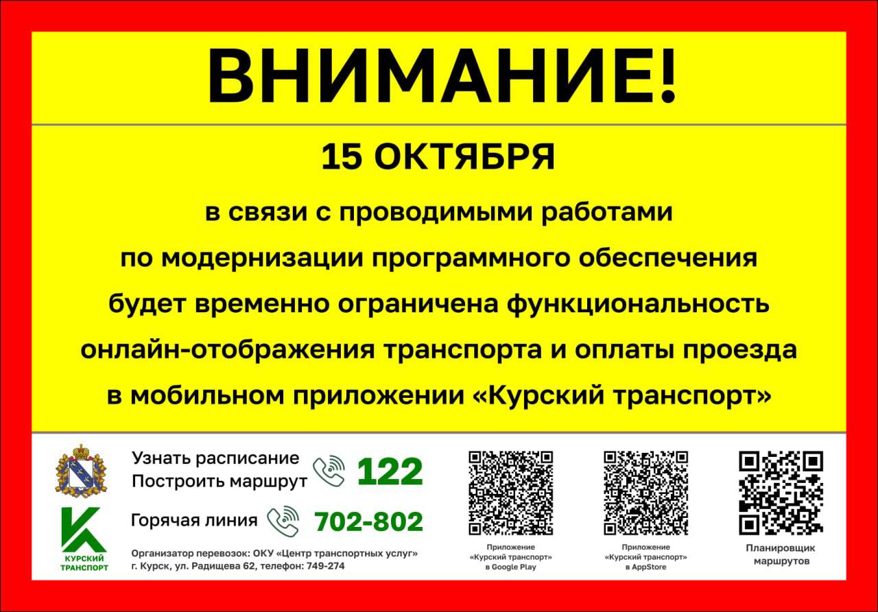 В связи с проведением работ по модернизации программного обеспечения, возможны временные сбои в работе мобильного приложения "Курский транспорт". Об этом сообщает врио министра транспорта и автомобильных дорог Александр Замараев.