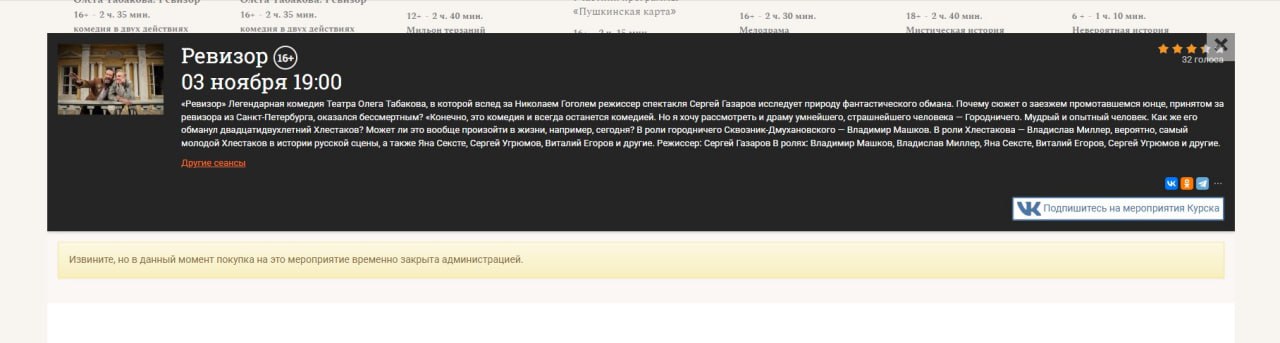 Нам пишут: "На сайте драмтеатра на гастрольные спектакли Машкова и Миронова ровно в 10:00 появилась запись: "Извините, но в данный момент покупка на это мероприятие временно закрыта администрацией... "