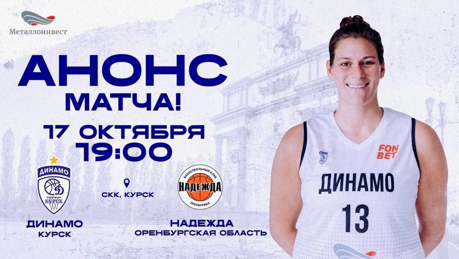 Баскетболистки «Динамо» 17 октября проведут в Курске второй домашний матч регулярного чемпионата женской премьер-лиги. Команда Сергея Вознюка сразится с вице-чемпионом прошлого сезона — оренбургской «Надеждой». Начало встречи в СКК на улице Энгельса в 19:00
