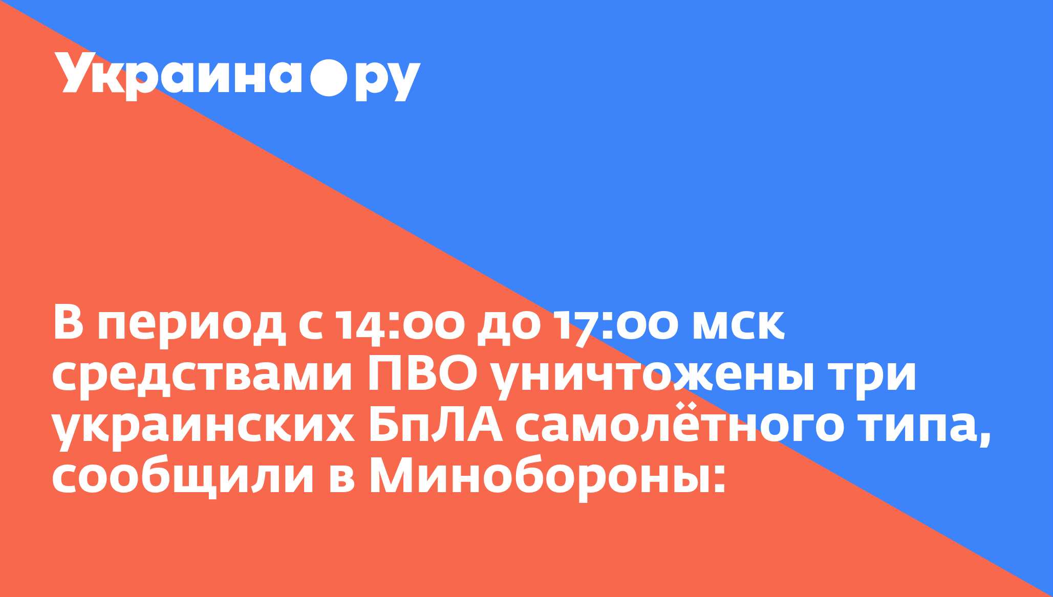 В период с 14:00 до 17:00 мск средствами ПВО уничтожены три украинских БпЛА самолётного типа, сообщили в Минобороны: