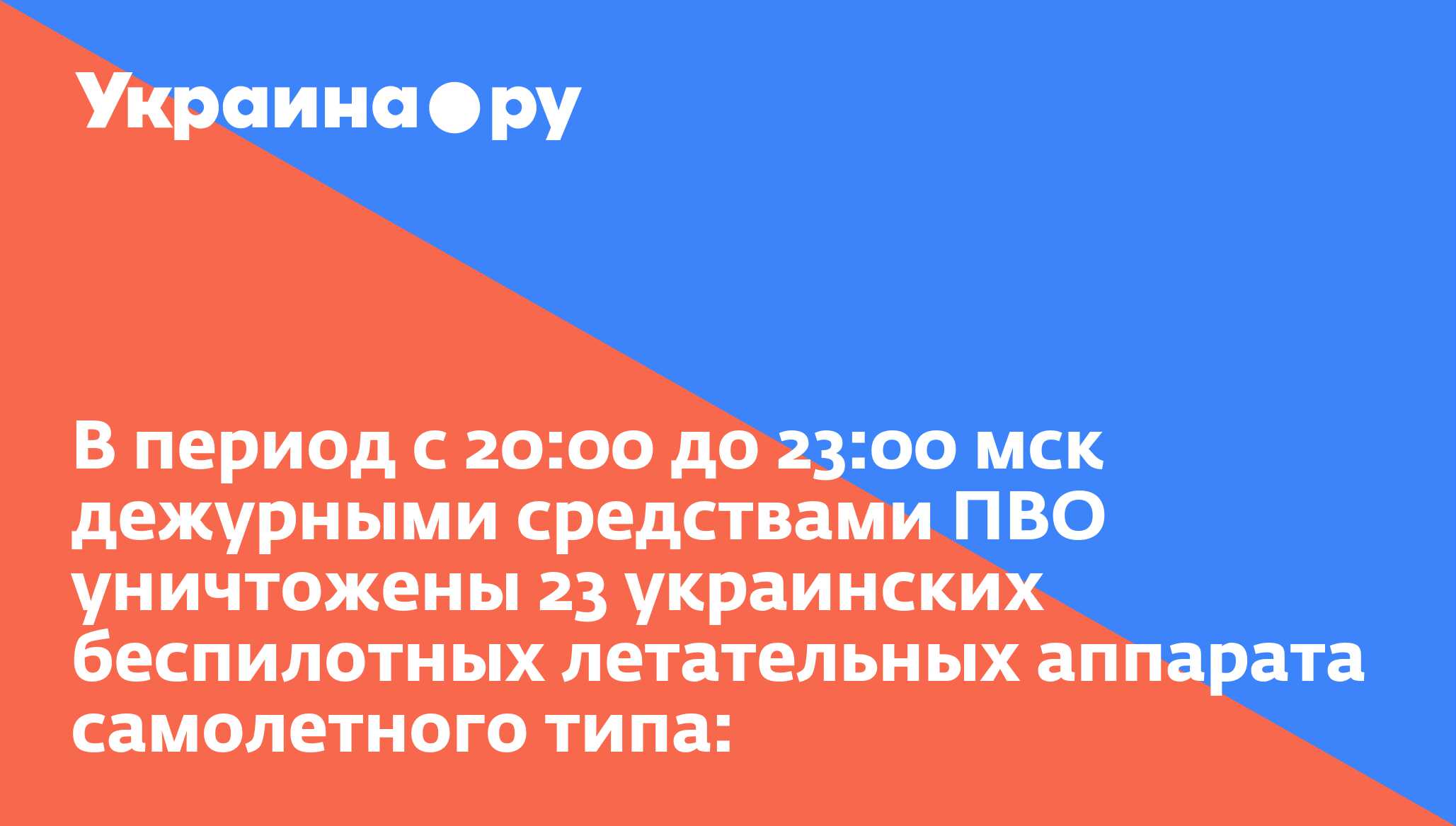 В период с 20:00 до 23:00 мск дежурными средствами ПВО уничтожены 23 украинских беспилотных летательных аппарата самолетного типа: