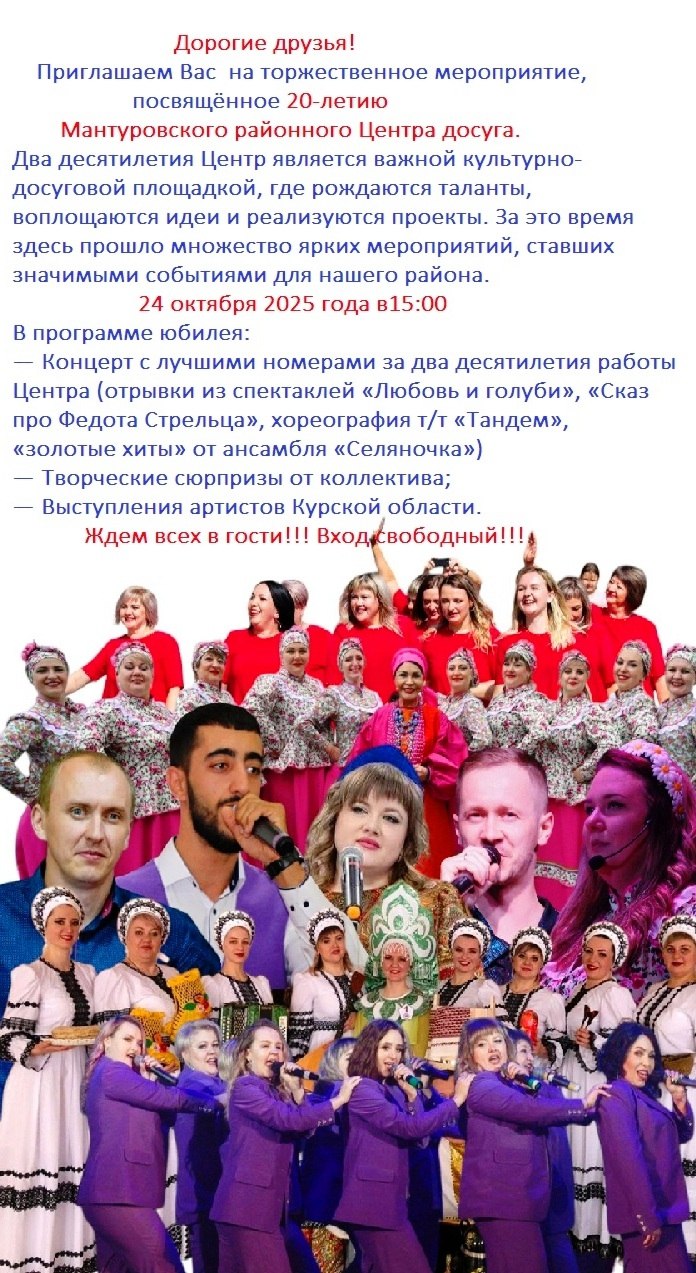 Дорогие друзья! Приглашаем Вас на торжественное мероприятие, посвящённое 20-летию Мантуровского районного Центра досуга. Два десятилетия Центр является важной культурно-досуговой площадкой, где рождаются таланты, воплощаются идеи и реализуются проекты. За это время здесь прошло множество ярких мероприятий, ставших значимыми событиями для нашего района. 24 октября 2025 года в15:00 В программе юбилея: — Концерт с лучшими номерами за два десятилетия работы Центра (отрывки из спектаклей «Любовь и голуби», «Сказ про Федота Стрельца», хореография т/т «Тандем», «золотые хиты» от ансамбля «Селяночка») — Творческие сюрпризы от коллектива; — Выступления артистов Курской области. Ждем всех в гости!!! Вход свободный!!!