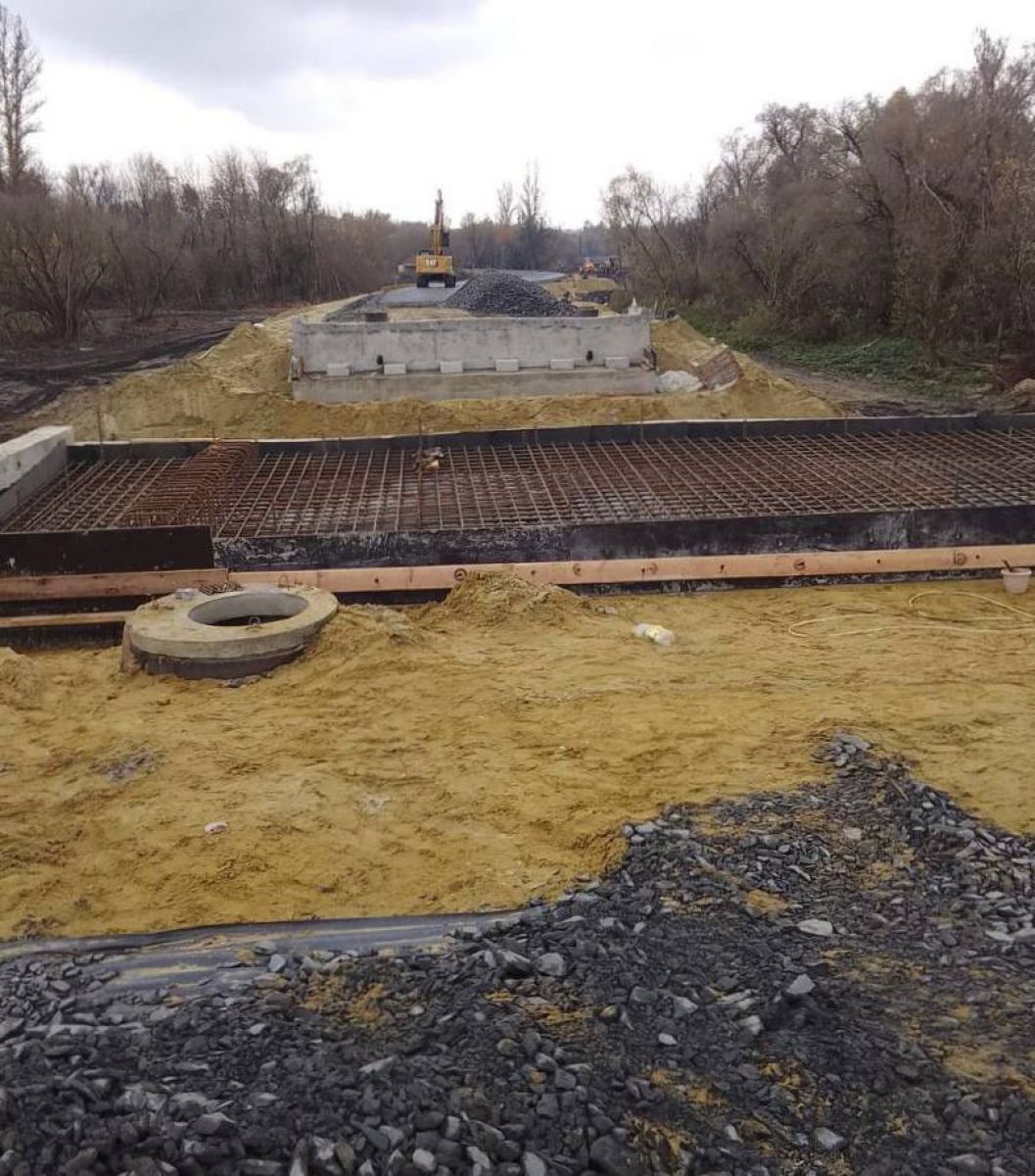 На данный момент выполнены работы по подготовке территории, обустройству ливневой канализации и возведению опор мостового сооружения. В настоящее время ведутся работы по формированию обочин, тротуаров и водоотводных лотков.