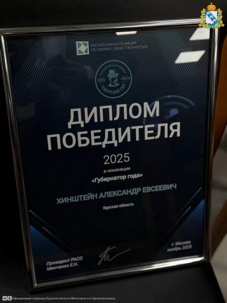 Глава Курской области Александр Хинштейн стал губернатором года по версии Российской ассоциации по связям с общественностью (РАСО), которая вручает премию «Гамбургский счёт».