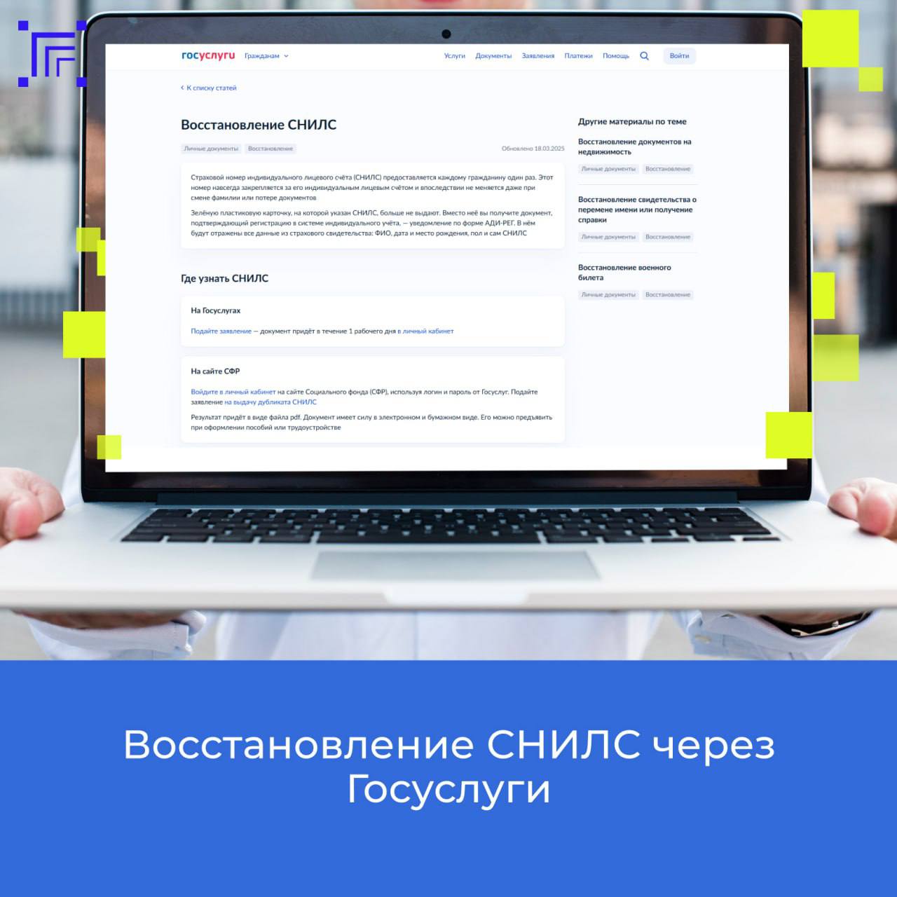 Теперь восстановить СНИЛС стало еще проще и удобнее, используя портал Госуслуг. Физический носитель (зеленая карточка) больше не требуется. Главное – знать сам номер СНИЛС. Развитие портала и цифровых сервисов проходит в соответствии с нацпроектом «Экономика данных».