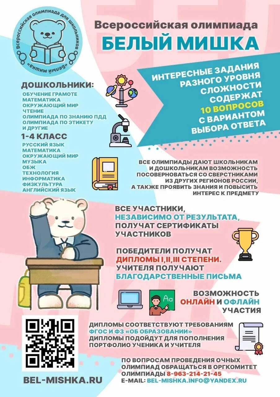 «Белый мишка» - Всероссийская метапредметная олимпиада для детей дошкольного и младшего школьного возраста. Она включает в себя тематические задания, вопросы на знание родной страны в блоке «Россия – моя Родина», проверку знаний правил дорожного движения и другое.